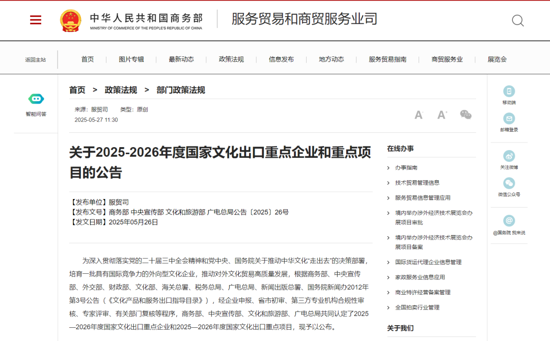 四部门发布2025-2026年度国家文化出口重点企业和重点项目