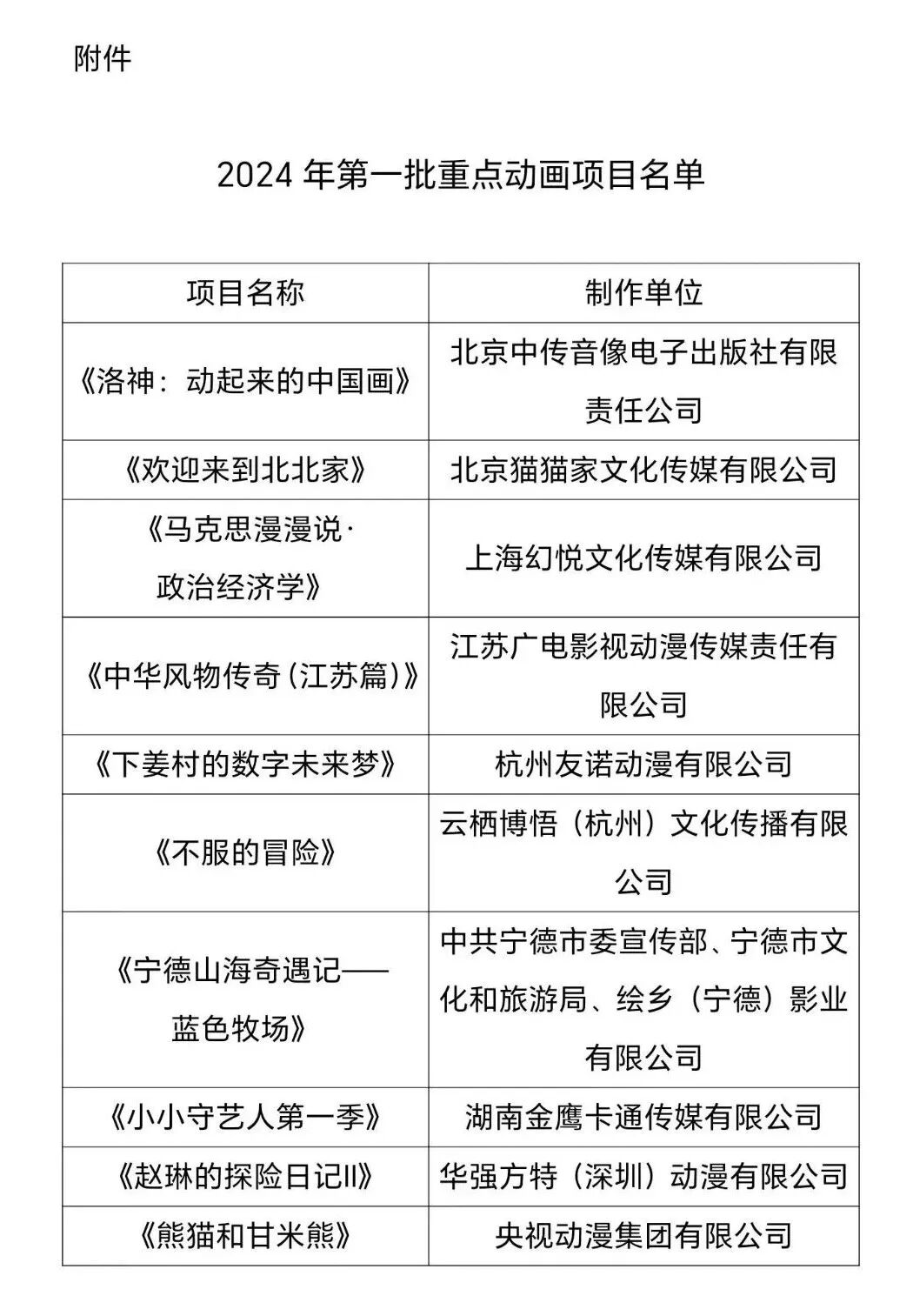 国家广播电视总局发布2024年“中国经典民间故事动漫创作工程(网络动画片)”重点扶持项目根据中办、国办《关于实施中华优秀传统文化传承发展工程的意见》中关于“实施中国经典民间故事动漫创作工程”的要求和有关工作部署,国家广播电视总局积极组织开展“中国经典民间故事动漫创作工程(网络动画片)”征集评选工作,各相关机构积极参与。经专家评审,国家广播电视总局确定了10部网络动画片作为2024年重点扶持项目,现予以公布。